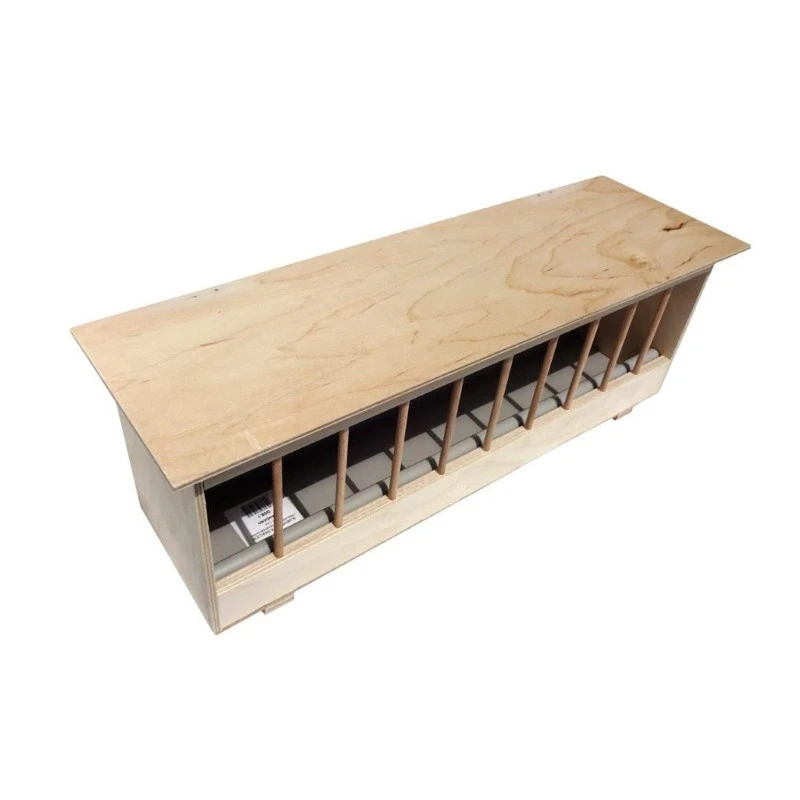 Stabiler Futtertrog aus Holz mit flacher Abdeckung. Inklusive eines passenden Kunststoffeinsatzes, der herausnehmbar und leicht zu reinigen ist. Optimal bei Verwendung von angefeuchteten Futter. Kein Verkleben oder Verpilzen mehr möglich!