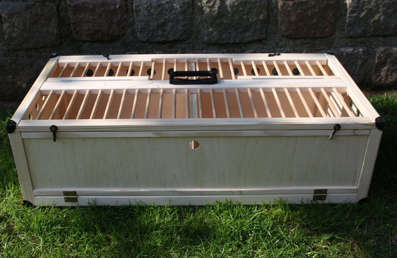 Robuster und leichter Taubenkorb mit zwei Klappen an der Oberseite, sowie einer großen Frontklappe. Enthalten ist zudem eine Mitteltrennung. Der Taubenkorb ist für den Transport von ca. 12 Tauben geeignet.